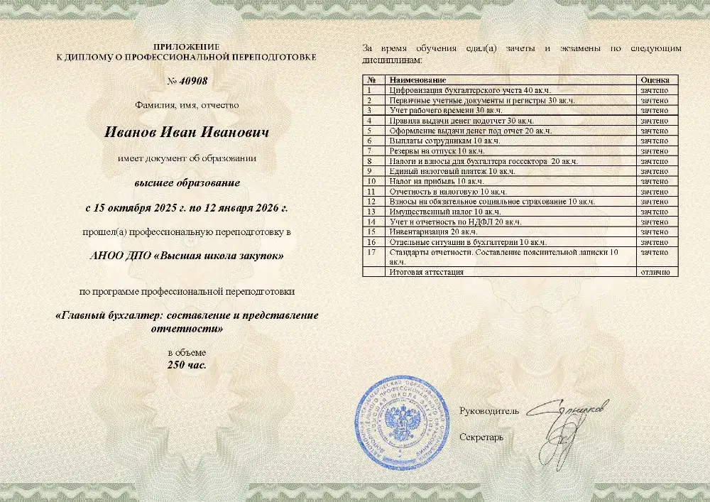 Профессиональная переподготовка. 256 академических часов, 8 модулей: постановка и ведение учета по общей системе налогообложения, налоги (НДС, налог на прибыль, НДФЛ) и страховые взносы, учет активов и расчетов, кадровый учет и расчет зарплаты, бухгалтерская и налоговая отчетность, планирование и внутренний контроль. Онлайн-обучение в в Смоленске с итоговой аттестацией.