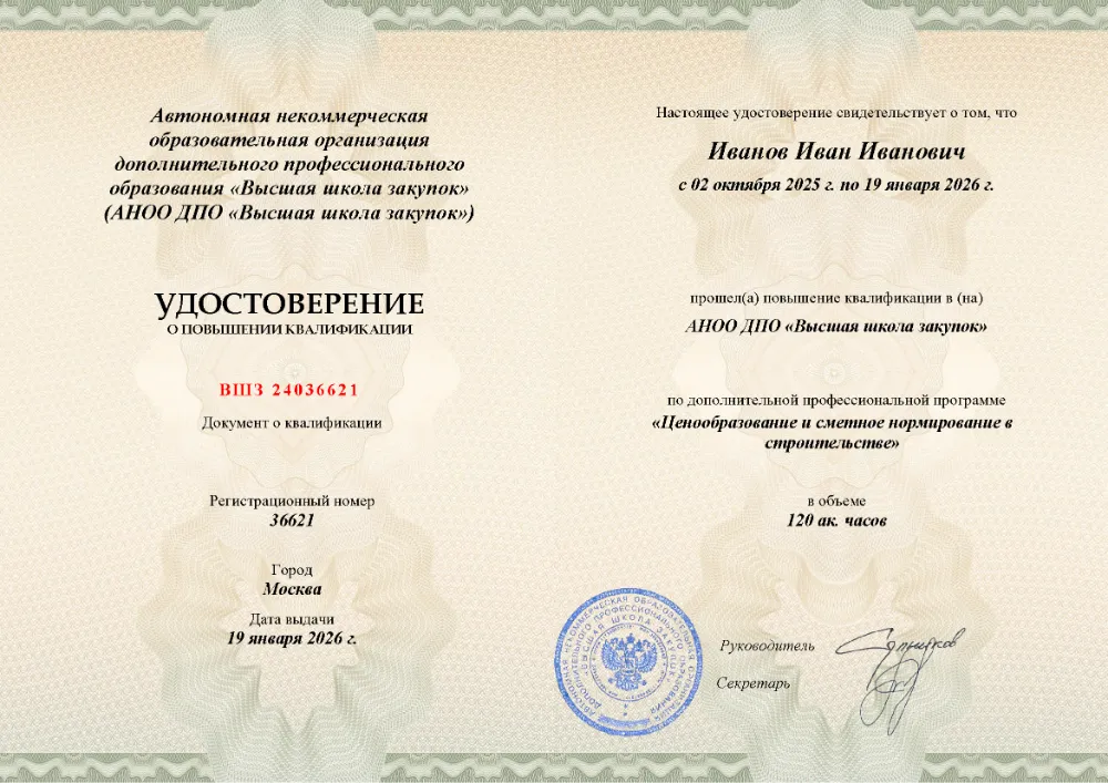 Повышение квалификации, 120 академических часов, 7 модулей: современное ценообразование и нормативная база, сметно-нормативные базы в строительстве, экономика сметной стоимости, определение стоимости ресурсов и конъюнктурный анализ, особенности расчёта стоимости монтажа и пусконаладочных работ, практическое составление смет в MS Excel, работа в программе «ГРАНД-Смета». Онлайн-обучение в в Смоленске с итоговой аттестацией.