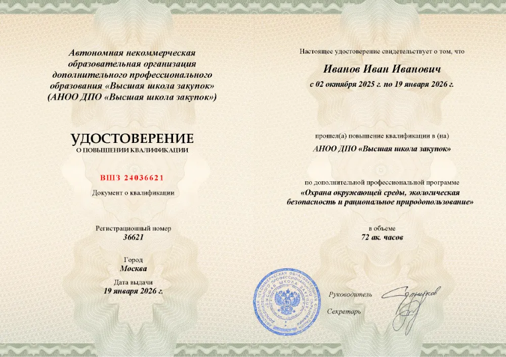 Повышение квалификации, 72 академических часа, 6 модулей: нормативно-правовые основы и государственное регулирование в сфере экологии, лицензирование деятельности, экологический надзор, ответственность за нарушения и рациональное природопользование. Онлайн-обучение в в Смоленске с итоговой аттестацией.