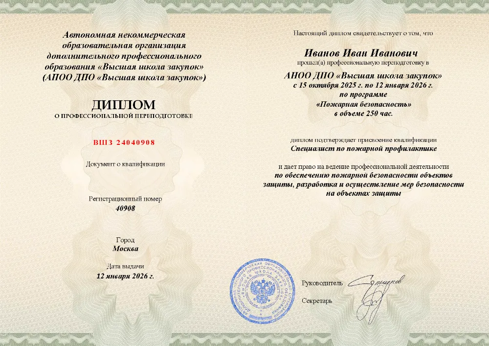 Профессиональная переподготовка, 250 академических часов, 11 модулей: организационные основы и законодательство в области пожарной безопасности, лицензирование и надзор, требования к объектам защиты, проектирование, тушение пожаров и оказание первой помощи пострадавшим. Онлайн-обучение в в Смоленске с итоговой аттестацией.